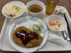 この日のメニューは、大きな「とんかつランチ」です。とんかつは3枚まで選ぶことができましたよ。