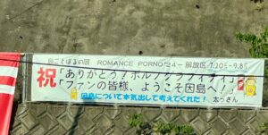 ファンの方ならご存じ?の ポルノグラフィティの二人が 因島出身ということもあり7 月20 日( 土)~島内各所で「島ごとポルノ展」というのが開催されており、のぼりがたくさん。まるでお祭り騒ぎ。